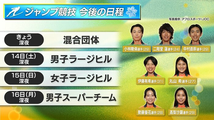 ジャンプ競技、今後は日本時間10日深夜に混合団体、14日深夜に男子ラージヒル、15日深夜に女子ラージヒル、16日深夜に男子スーパーチームが行われます。