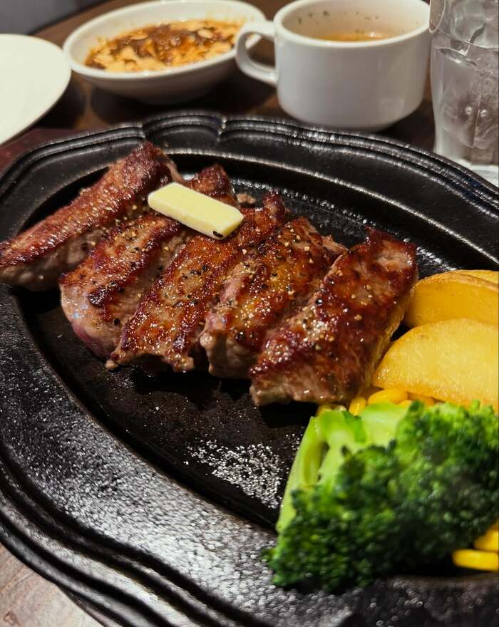 そんな注文したメニューを見てみると、ボリュームのあるステーキ!香ばしい焼き色に、思わず食欲をそそわれてしまいます。
