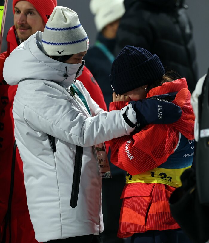 そして、北京五輪のスキー団体にともに出場していた伊藤有希選手が髙梨選手の元へかけつけると、思わず涙があふれます。4年前、自らのスーツの規定違反で失格になってしまい流した悔し涙が、安堵や喜びの涙になった瞬間です。