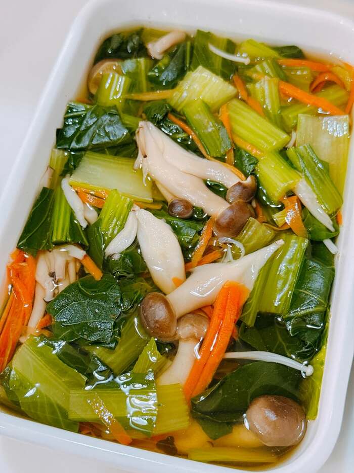 まずは、ぶなしめじや葉物野菜、にんじんなど、多種類の野菜が煮汁につかっている「煮浸し」から。彩り豊かに仕上げられた栄養たっぷりの料理は、作り置きにもってこいですね!
