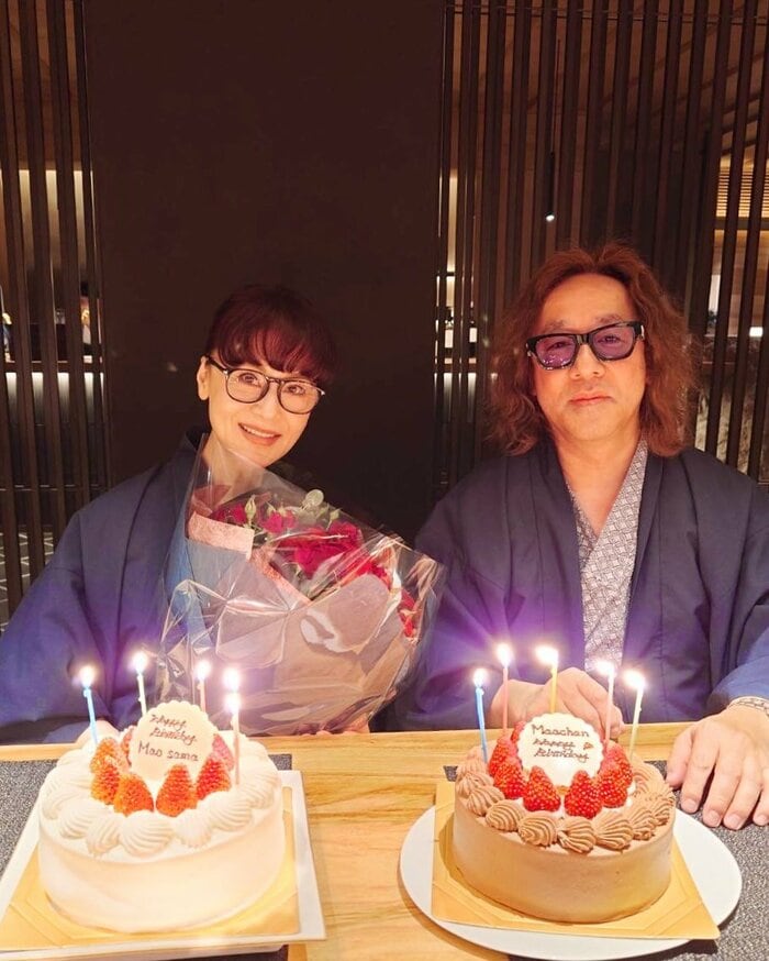 さらに、ショートケーキとチョコレートケーキがホールで2つ並ぶ前で、赤いバラの花束を抱え、夫婦仲良く写真に収まる姿も披露。2人とも同じ浴衣を着たペアルック姿で、大地さんは黒縁メガネ、森田さんは薄いカラーレンズ入りの黒縁メガネをかけています。