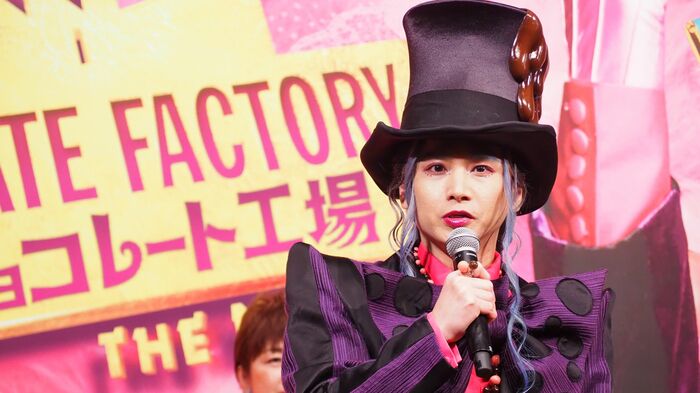 人間不信に陥り、世間から身を隠して自らのチョコレート工場に閉じこもり続けているウィリー・ウォンカ役の堂本さんは、劇中で着用するカラフルな衣装で登壇。