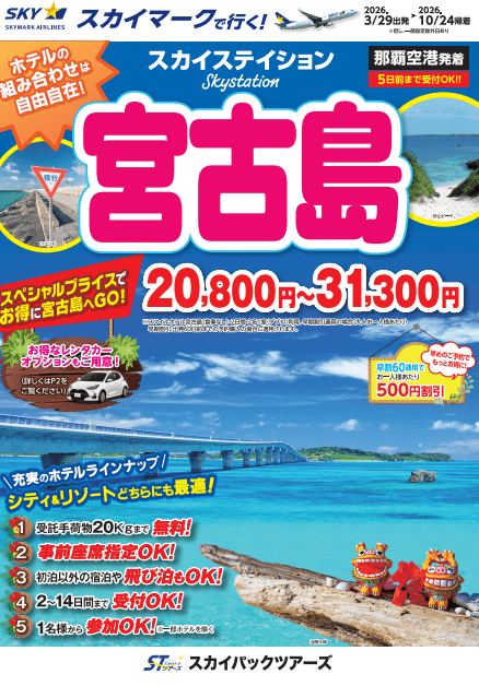 スカイパックツアーズ株式会社(本社:東京都中央区、社長:横山正巳)は、スカイマークを利用した価格固定型のパンフレット旅行商品「スカイステイション 宮古島」【那覇空港発着】(2026年3月29日出発~2026年10月24日帰着)の販売を開始します。スカイマークだけを取り扱う専売店だからできるスペシャルプライス!早めのご予約がお得です。羽田・茨城・中部・神戸・福岡などからスカイマークで沖縄本島滞在の旅行に申し込み、2日目は那覇発のツアーで宮古島を体験するのもおすすめ!