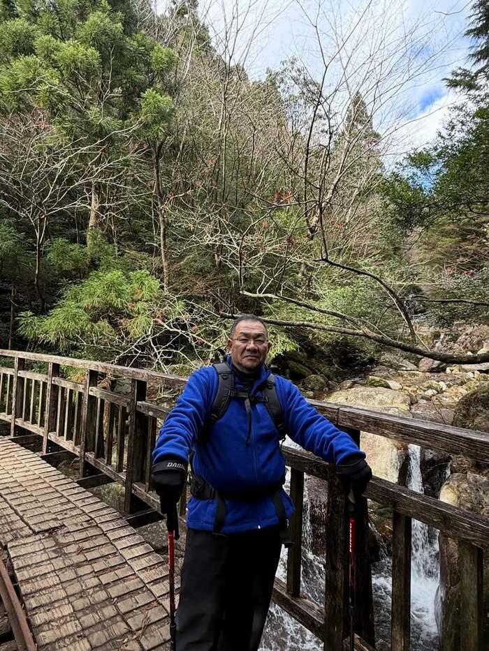 公開された写真には、青のウェアに黒のパンツを合わせ、両手にトレッキングポールを持ち、橋の上でポーズを決める村重さんの父の姿が。