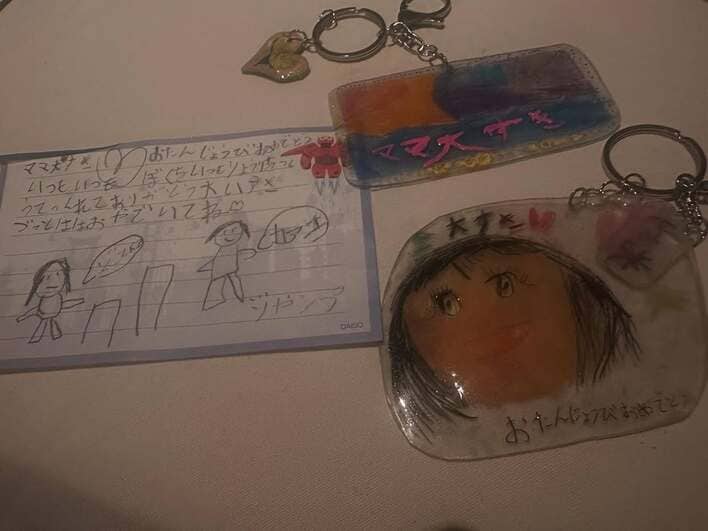今回の誕生日には次男が色々準備したと言うことで、投稿された写真には「ママ大好き」という書き出しから始まる手紙や、「ママ大好き」と書かれた似顔絵入りのキーホルダーが写っています。