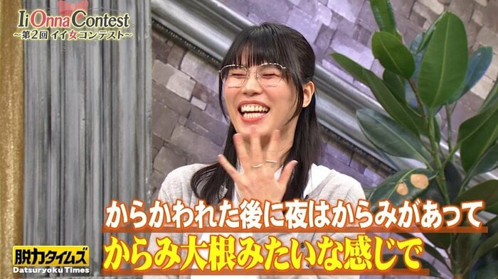 紺野さんは「やっぱり、からかわれることすらも興奮に変える。夜は、からみがあって“からみ大根”みたいな感じで…」と、うまいこと言ってスタジオを笑わせました。