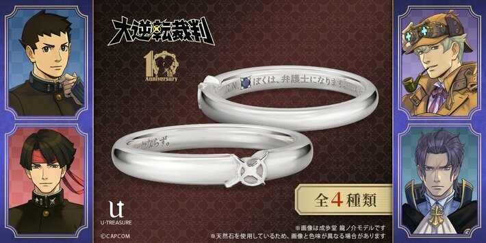 このたびの新作は、「大逆転裁判」シリーズ10周年を記念して製作されたメッセージリング(指輪)です。表側にはロゴに使われているモチーフを、内側には4人の印象的なセリフとイニシャルを刻印し、キャラクターそれぞれをイメージした天然石をあしらいました。