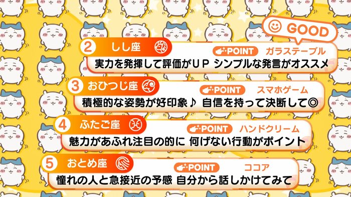『めざましテレビ』で放送中の「ちいかわ占い」 テレビ放送がない日はお休みで、月~土:朝7時以降に更新予定です。