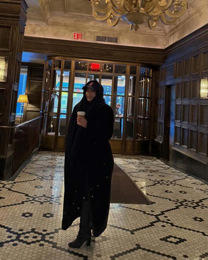 ガラス張りのエントランスを背に、ロビーにたたずむ長谷川さん。黒いロングコートにロングブーツ、頭にはキャップを合わせたスタイルで、片手にカップのドリンクを持ち、にっこりとほほ笑んでいます。ロビーの床には、レトロな雰囲気ただよう白と黒のモザイクタイルが張り巡らされていて、木製の壁や柱など重厚感のある内装がとっても素敵です。