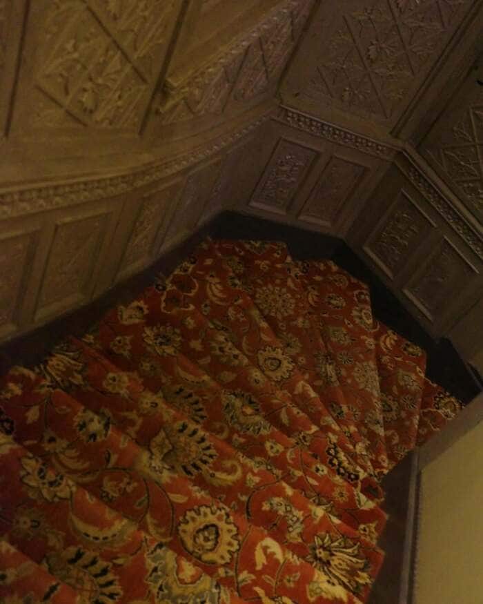 また、重厚な木彫りの壁に囲まれたクラシカルな階段には、ダマスク柄のような赤いじゅうたんが敷かれていて、ヨーロッパの古城の一角を思わせるようなエレガントな空間が広がっています。