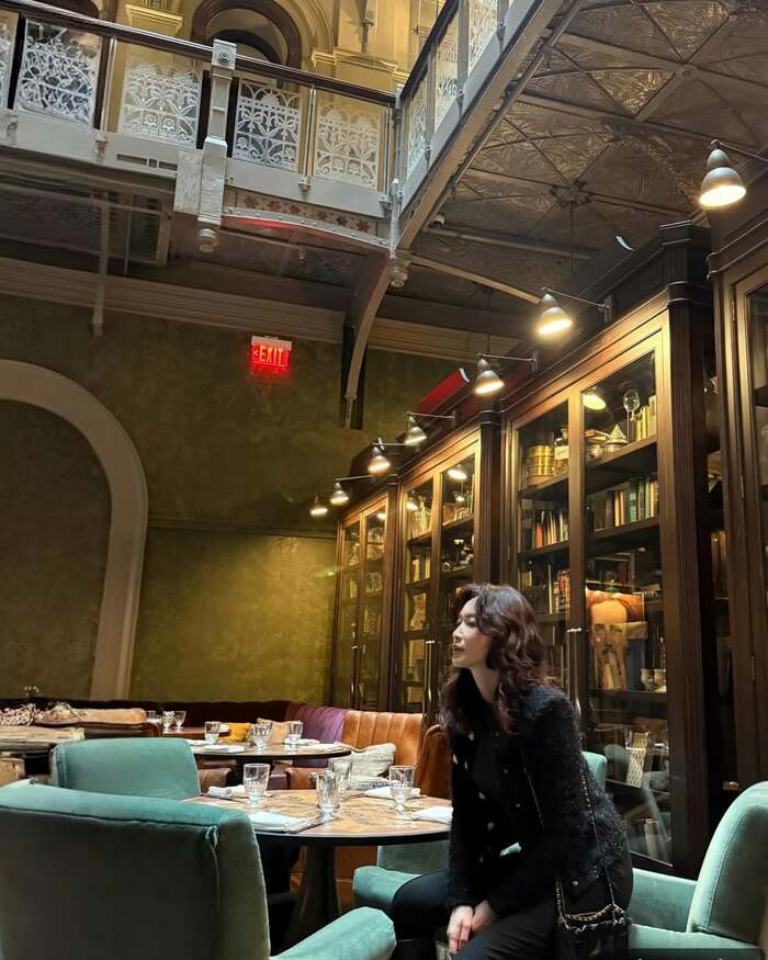 そして、開放感あふれる吹き抜けのレストランで、緑のベルベット調のソファの肘掛けに腰を下ろし、遠くを見つめたショットも公開。壁には背の高い木製のキャビネットが置かれていて、中にはたくさんの本や雑貨が並んでいます。