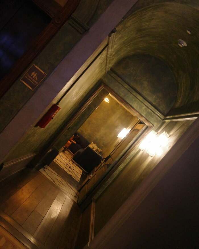 部屋の入り口へと続く廊下は、天井がアーチ型のデザインをしていて、優雅な雰囲気に。くすんだ緑の壁紙や木の床、温かみのある暖色のライトなど、まるで美術館にいるような気持ちになります。
