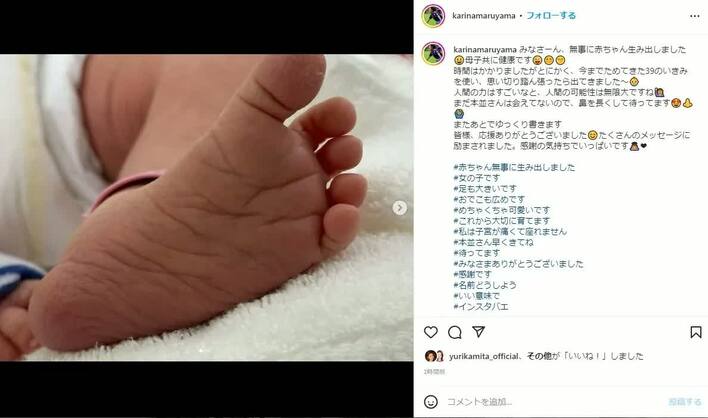 また、丸山さんは、自身のInstagramを更新し出産を報告。赤ちゃんの足の写真とともに、「時間はかかりましたがとにかく、今までためてきた39のいきみを使い、思い切り踏ん張ったら出てきました〜」と投稿し、ファンへの感謝も綴りました。