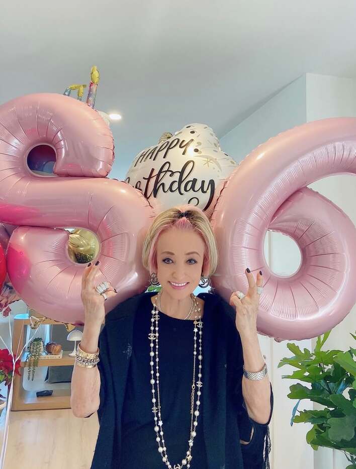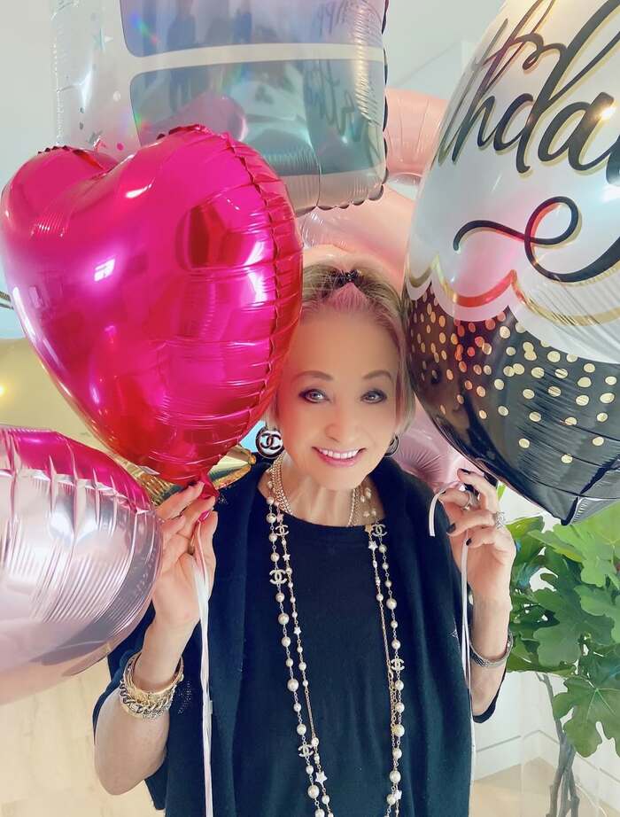 公開されたショットには、8と6の大きなピンクのバルーンを背に、ダブルピースサインをした母の姿が。母は、黒のトップスにシャネルのネックレスを合わせたスタイルで、うれしそうににっこり笑顔を浮かべて、カメラを見つめています。
