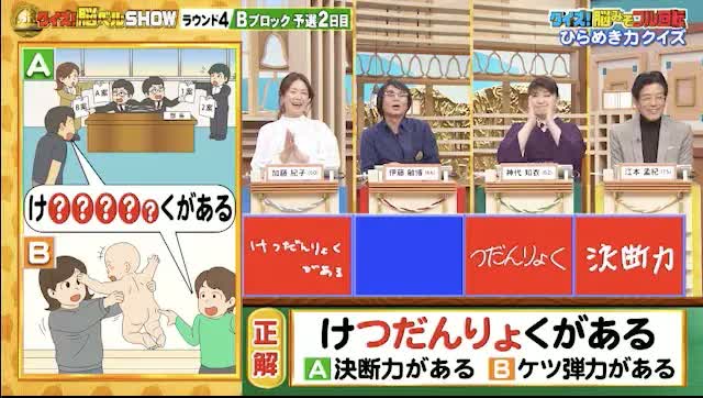正解は「けつだんりょくがある(決断力がある/ケツ弾力がある)」。加藤さん、神代さん、江本さんの3人が正解。