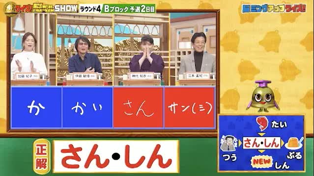 正解は「さん(通算、退散、サンプル、三振)」もしくは「しん(通信、耐震、シンプル、心身)」。神代さん、江本さんが正解。