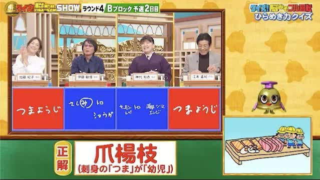 正解は「爪楊枝(刺身の『つま』が『幼児』)」。加藤さん、江本さんが見事正解!