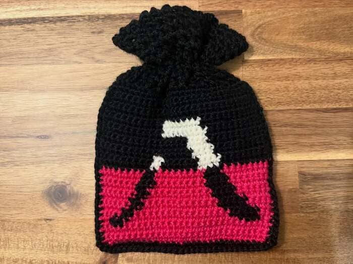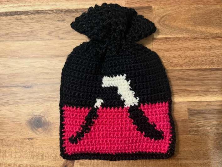 公開された写真には、きゅっと口を絞った巾着型の厚手のポーチが写っています。黒を基調に、赤い毛糸を差し色にしたデザインで、中央には八嶋さんの名前にちなんだ「八」の文字が大きく編み込まれています。