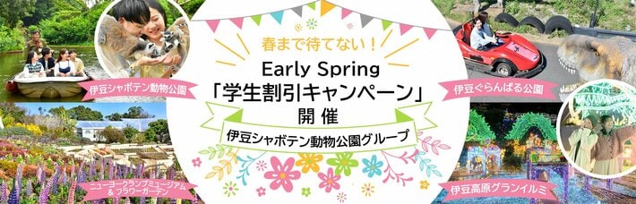 伊豆シャボテン動物公園グループでは、伊豆シャボテン動物公園・伊豆ぐらんぱる公園・伊豆高原グランイルミ及びニューヨークランプミュージアム&フラワーガーデンにおいて、2026年2月21日(土)~3月19日(木)まで、\春まで待てない!/Early Spring「学生割引キャンペーン」を実施いたします。