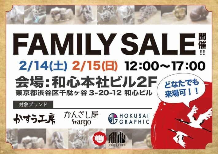 『日本のカルチャーを世界へ』というビジョンのもと、簪(かんざし)や和傘・和柄傘、箸等の和小物を全国で複数展開する株式会社和心(東京都渋谷区、代表取締役社長:森 智宏、東証グロース:9271)は、2026年2月14日(土)・15日(日)の2日間、東京千駄ヶ谷本社にて「本社ファミリーセール」を開催いたします。