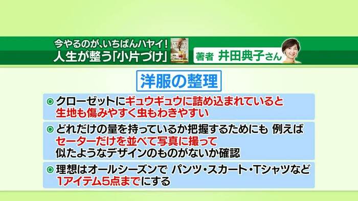 井田さんは「クローゼットに洋服がギュウギュウなら、まずは虫などがつかないように風を通す」という基本から、「1アイテム5点までと決める」などクローゼットを整理する方法を伝授。