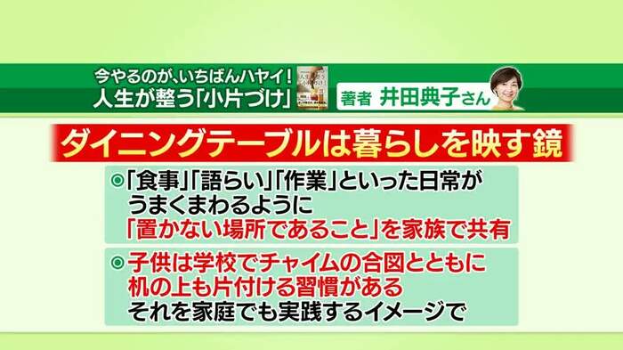 とダイニングテーブルの片付けに悩んでいる人の多さが浮き彫りになり、井田さんが片付けを担当した家庭のダイニングテーブルの様子も紹介されました。