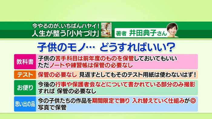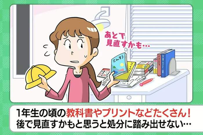 まず登場したのは、「小2の子供の荷物が多いので新学期前に整理したいのだが、小1の教科書や授業で使ったプリントなど処分に踏み出せない」というお悩みです。