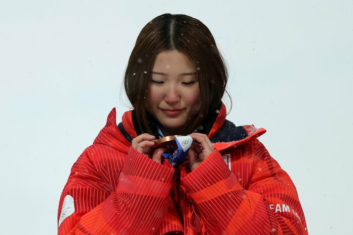 TEAM JAPANの赤いジャケットに身を包み、獲得した銅メダルを両手で包み込むように大切そうに手に取る小野選手。静かに見つめる姿が印象的に映し出されました。