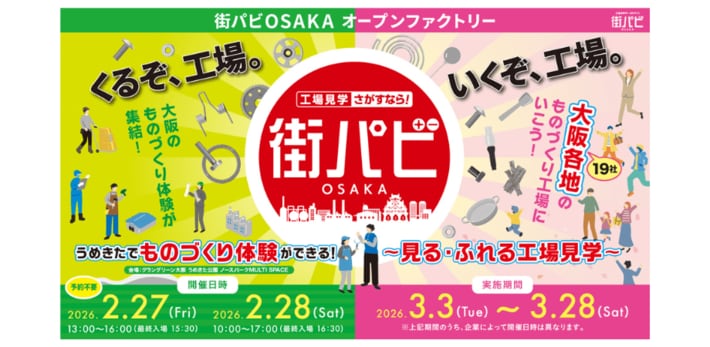 大阪のものづくり企業を支援するMOBIO(ものづくりビジネスセンター大阪(※1))では、2月~3月の2か月間にわたり「街パビOSAKAオープンファクトリー」を開催します。