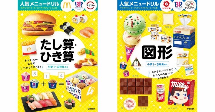『人気メニュードリル』シリーズの続刊が発売。マクドナルド・サーティワン アイスクリーム・スシローで『たし算・ひき算』が、ヤマザキパン・サーティワン アイスクリーム・不二家で『図形』が学べる。