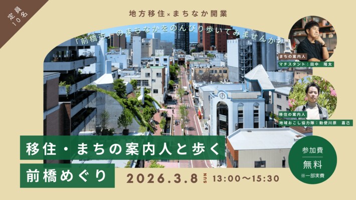 前橋市は、移住を検討されている方を対象に、案内人とまちなかをのんびり歩きながら、実際の暮らしに触れるイベント『移住・まちの案内人と歩く前橋めぐり(以下 本イベント)』を、2026年3月8日(日)に開催します。 現在、本イベントの参加者を募集しております(定員10名程度・抽選制)。