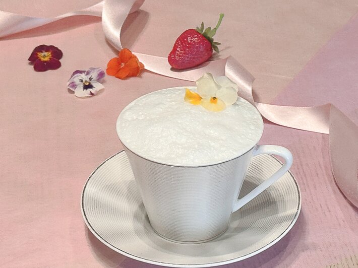 花びらを浮かべた苺のホットドリンクを苺スイーツとともに