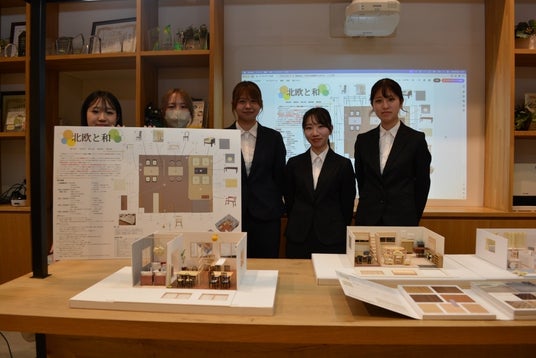 3チーム・計18名の学生が「北欧カジュアル」「北欧と和」「最新の和」をテーマに提案。次年度大型分譲地の販売センターづくりへ大きなヒント