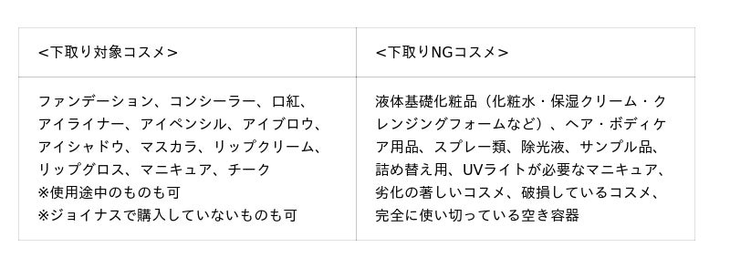 大好評の「コスメ下取り3DAYS」を今年も開催!2023年には5,000名さま以上、2024年、2025年には7,000名さま以上にご参加いただいた、ジョイナスで大人気のキャンペーンです。「買ったけれど色が合わなかった」「試してみたけれど肌に合わなかった」そんな理由で使いきれずに眠っているコスメを、おトクに活用いただけます。