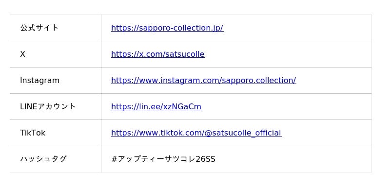 2026年5月17日(日)に札幌コンベンションセンター(札幌市白石区)で開催される今回は、UP-T(アップティー)がメインスポンサーに決定したことにより、イベントタイトルを『UP-T Presents SAPPORO COLLECTION 2026 SPRING/SUMMER』(略称:アップティー サツコレ2026SS)としてお届けいたします。