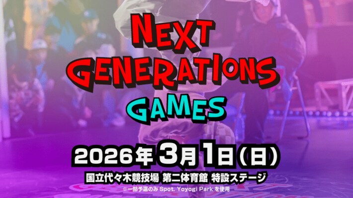 一般社団法人渋谷未来デザイン(代表理事:小泉秀樹、以下、渋谷未来デザイン)が主管を務める、ストリートスポーツ振興およびマナー向上の啓発を目的とし、若年層が積極的に参加できるストリートスポーツプロジェクト「Next Generations」は、2026年3月1日(日)、国立代々木競技場 第二体育館および代々木公園内「Spot. Yoyogi Park」を舞台に、U-15世代を対象としたストリートスポーツ&カルチャーの大会「NEXT GENERATIONS GAMES 2026」を開催いたします。