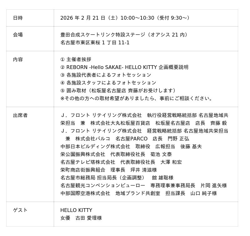 この度、J.フロント リテイリンググループ(松坂屋名古屋店、名古屋PARCO)は、中日ビル、オアシス21、中部電力MIRAI TOWERとともに、長年名古屋・栄の発展に貢献してきました栄町商店街振興組合の協力を仰ぎ、栄エリアプロモーションのさらなる強化を図ります。その一環として、施設の枠組みを超えて連携し、名古屋・栄エリアの施設を横断し、街の賑わいを創出する【REBORN -Hello SAKAE- HELLO KITTY】キャンペーンを2026年2月20日(金)から3月8日(日)までの17日間、開催します。