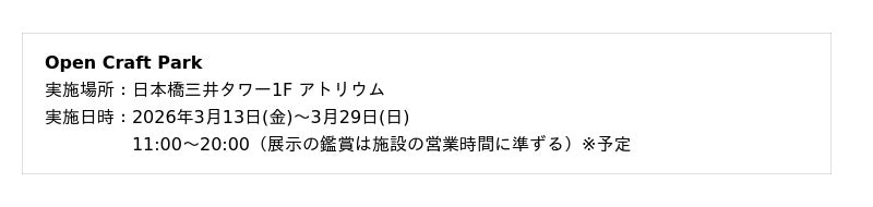 イベントの入口となる拠点会場「Open Craft Park」を、日本橋三井タワー1F アトリウムに展開いたします。