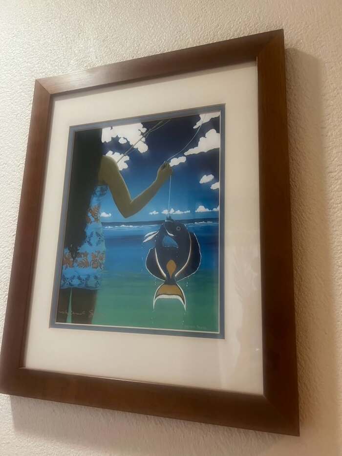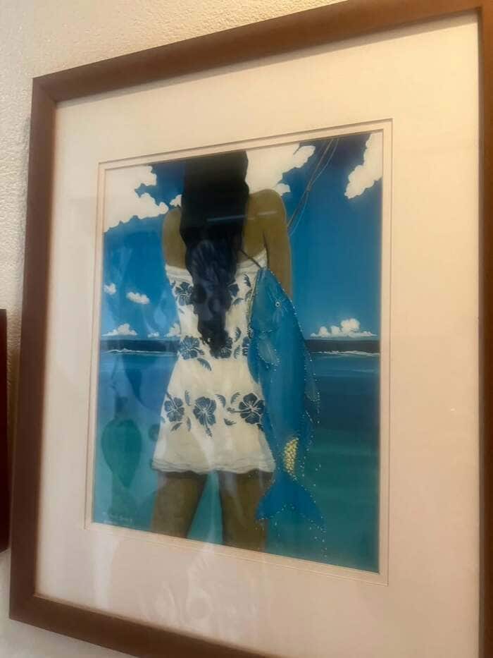 飾られているのは「15年ほど前にマウイ島のラハイナで手に入れました。」とつづった、海辺で釣りをしている少女を描いた作品。キャシーさんは「バニアンツリーの下で毎週末にやっていたアートフェアで、出会った絵です♪」と思い出の絵であることを伝えました。