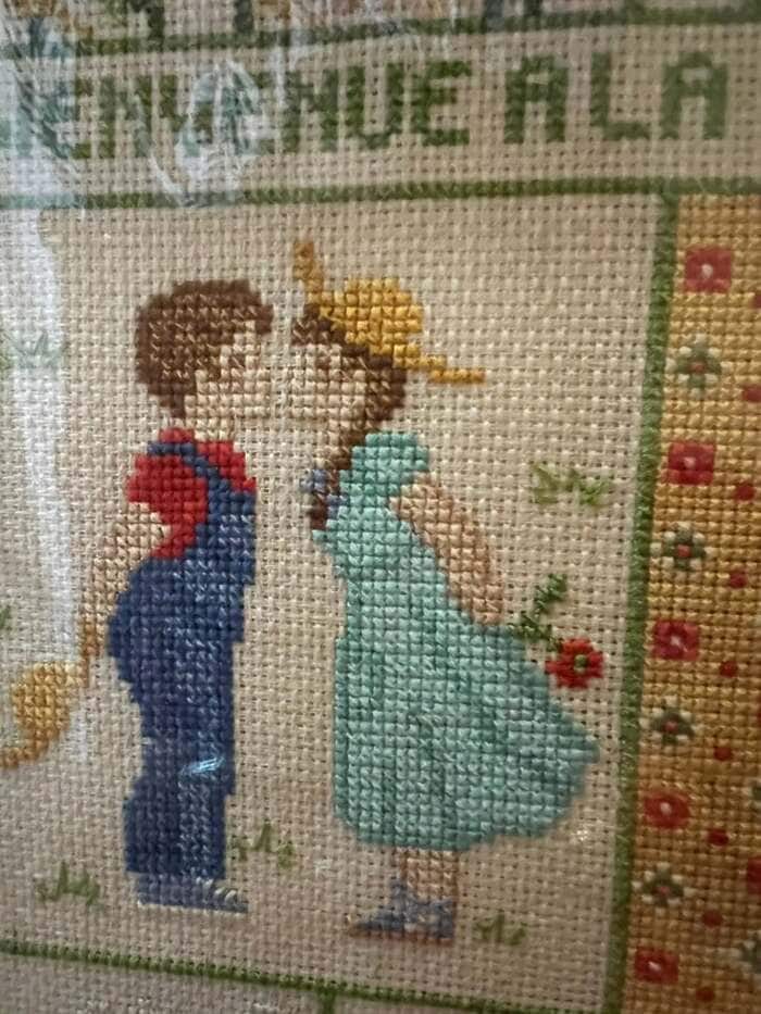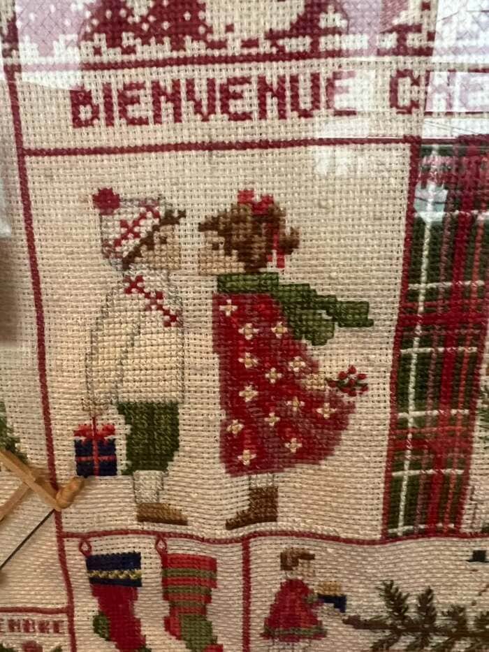 クロスステッチ作品は、フランス・パリの手芸屋で購入したキットをキャシーさん自ら刺繍したそう。一針一針の丁寧さが伝わる、さすがの出来栄えです。