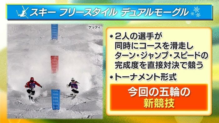 デュアルモーグルは、今回の五輪の新競技。2人の選手が同時にコースを滑走し、ターン・ジャンプ・スピードの完成度を、トーナメント方式、直接対決で競います。