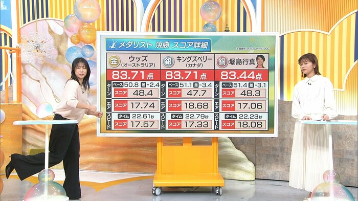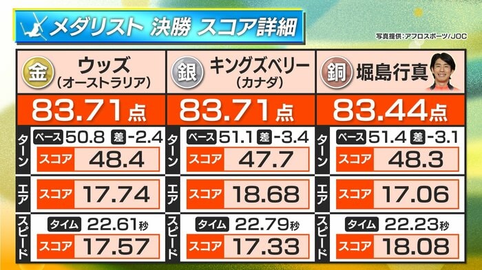 改めて今回のメダリスト3人のスコアを振り返ると、堀島行真選手は83.44点。1位のウッズ選手の83.71とはわずか0.27の差でした。