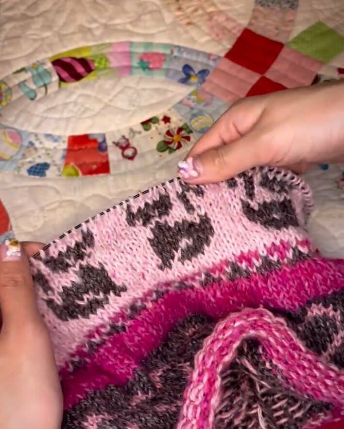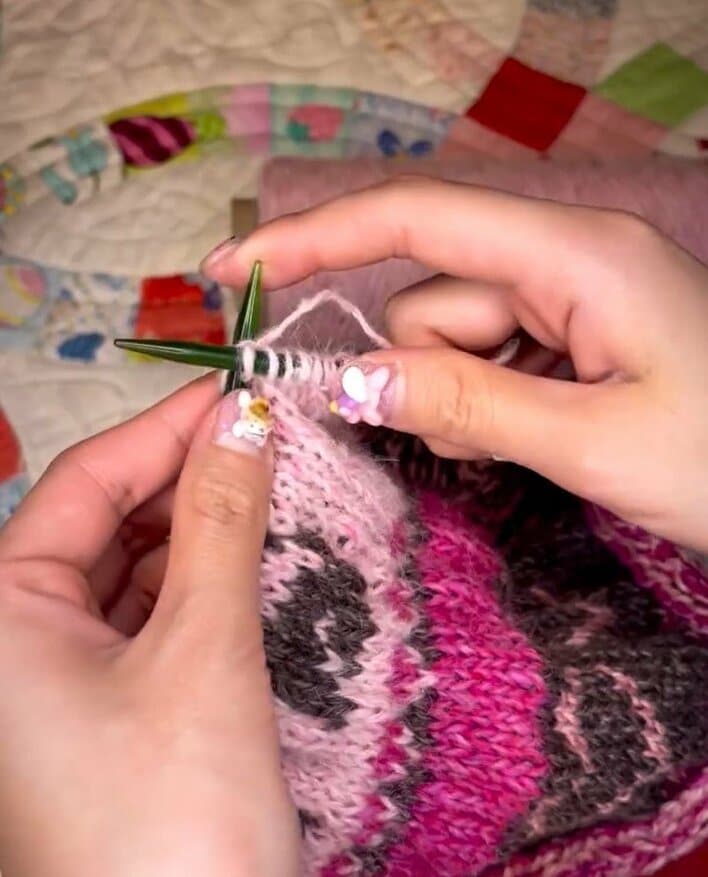 近くにはピンク色の毛糸が置かれていて、ひたすら糸を引きながら編み続けているようです。迷いなく作業を進めていて、慣れていることが伝わってきます。