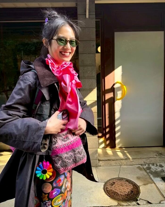 バッグに合わせたのでしょうか、鮮やかなピンク色のトップスを着用していて、街を歩いていたら目立つことまちがいなしです!