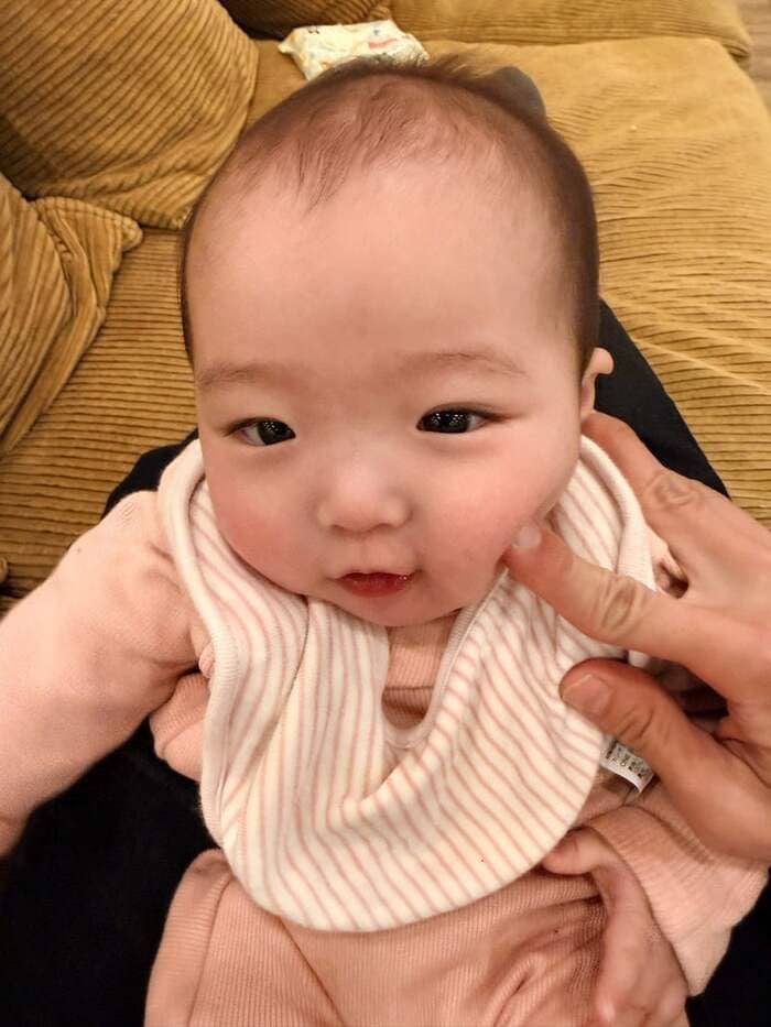 そこには、杉浦さんの膝の上にあお向けの状態で抱かれた夢空ちゃんの姿が。夢空ちゃんは目をぱっちりあけ、ほんのり口を開けてカメラを見つめていて、ほっぺは今にもこぼれ落ちそうなほどぷくぷく!杉浦さんはそのほっぺをちょん!と指で触っています。