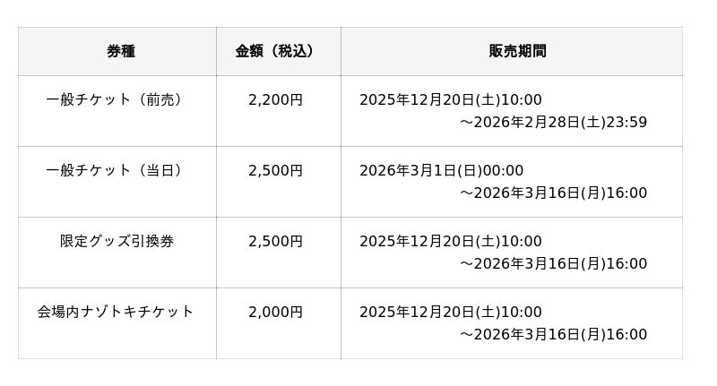 ※「限定グッズ引換券」のみでの入場はできません。別途、一般チケット(前売・当日)をご購入ください。