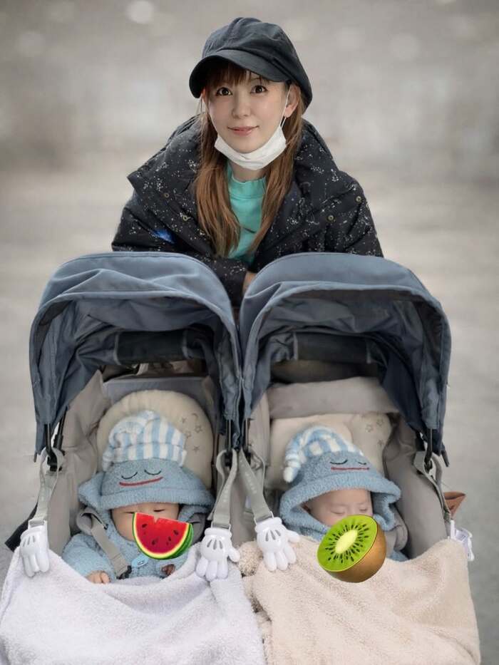 仲良く横並びのベビーカーに乗った双子は、お揃いのスライムの洋服に身を包み、色違いのブランケットをかけてぬくぬく♪中川さんも黒の帽子に黒のダウンを羽織ったあたたかな装いです。