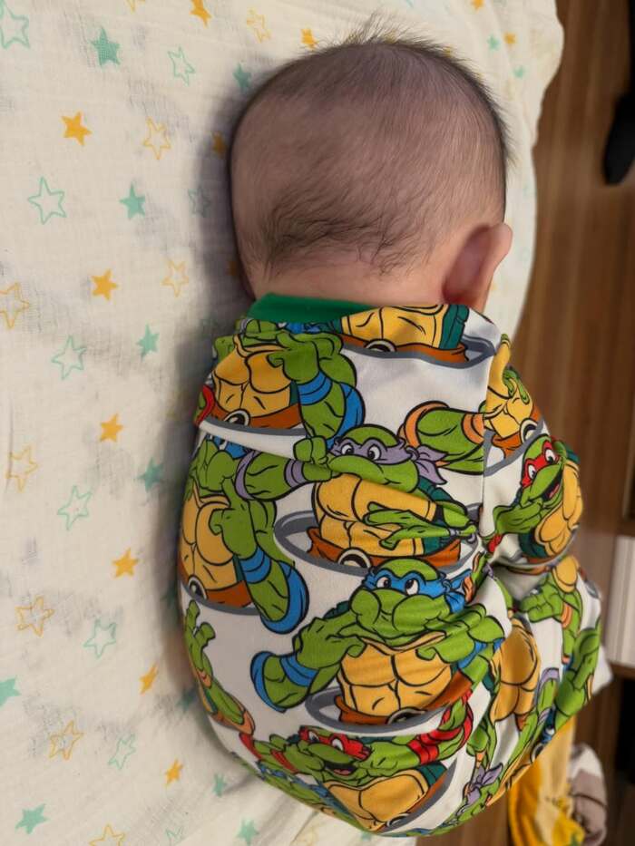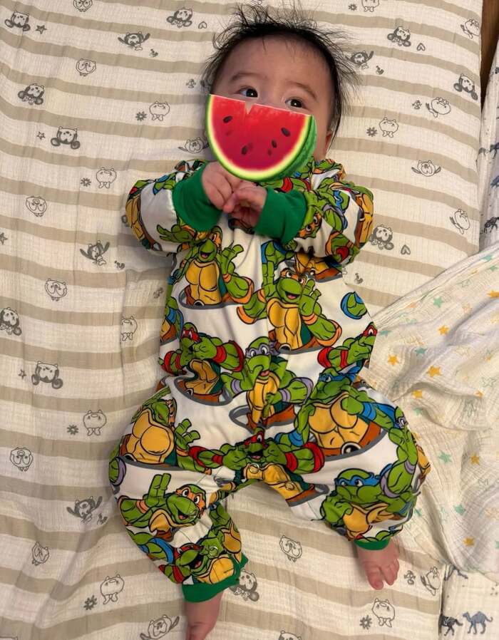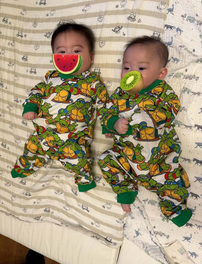 また「わたしが大好きなタートルズ 一目惚れしてふたつ買っちゃいました」とつづり、アメリカの大人気コミック「ティーンエイジ・ミュータント・ニンジャ・タートルズ」のキャラクターがあちらこちらにプリントされた洋服姿の双子を公開。