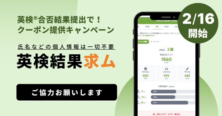 公式スコアの画像提出で、CSEスコア予測(合否判定)の精度向上に貢献できる!2/28までの提出で英検(R)学習アプリ「スタスタApps」有料会員Plus(1,000円)相当クーポンをご提供