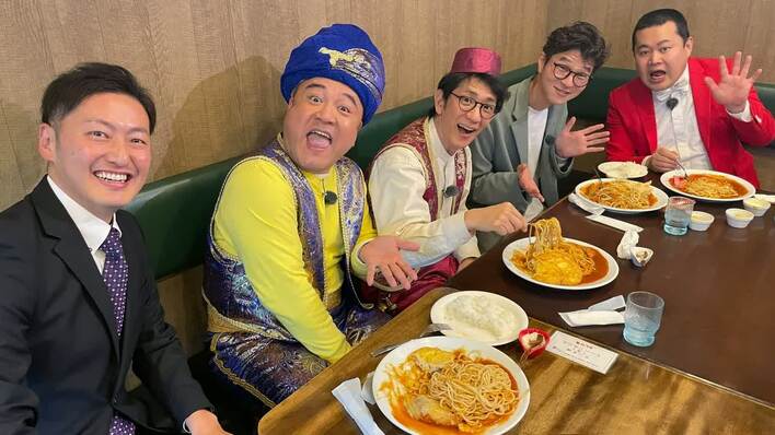 アンタッチャブル扮する、ザキヤ魔人(山崎弘也さん)とシバタン(柴田英嗣さん)が繰り広げる、ハイカロリーグルメバラエティ『腹ペコ魔人のグルメな魔法 脂過多ブラ』(3月1日放送/東海テレビ)。